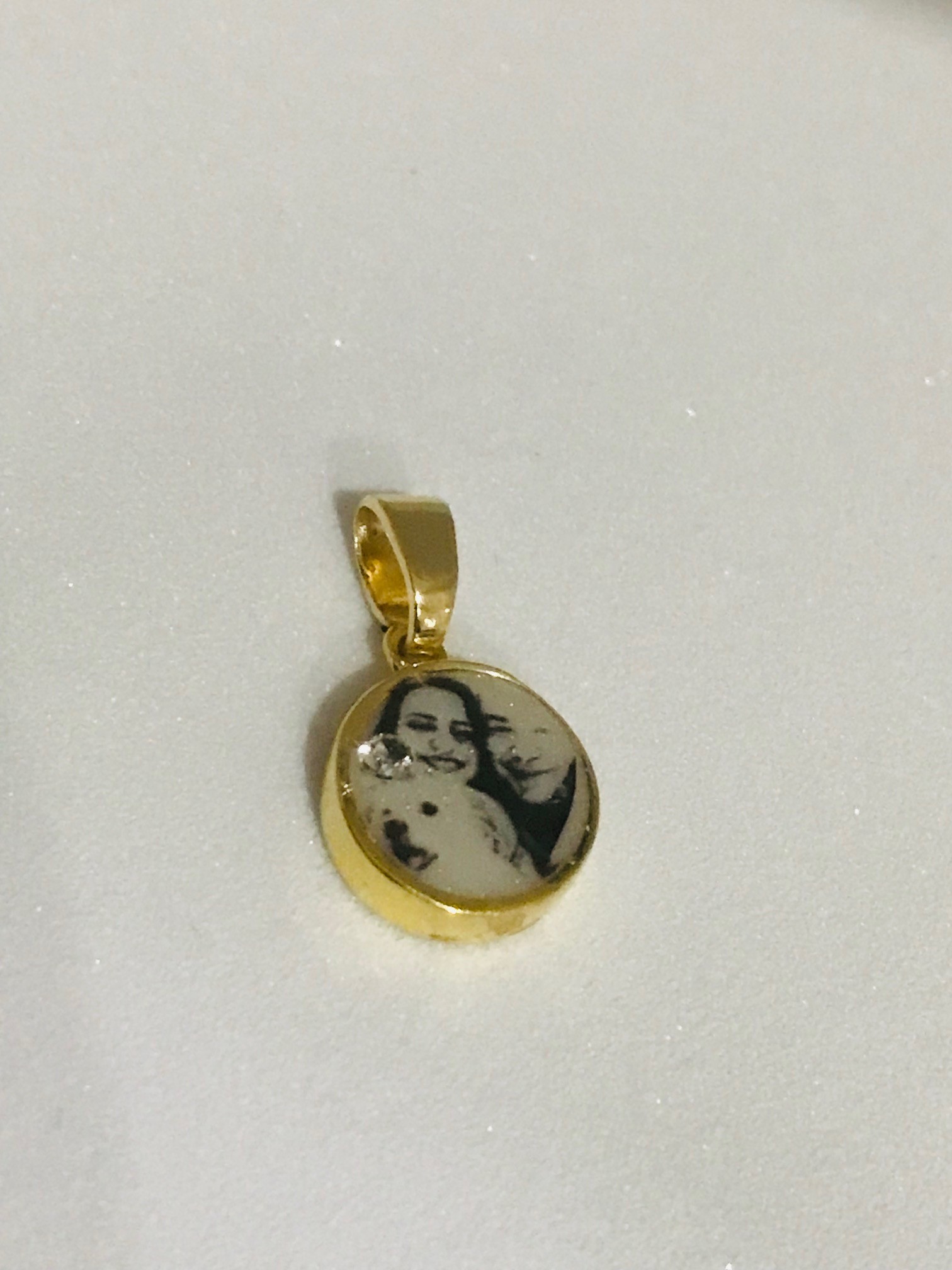 Moldura banhada a ouro 18k, com foto ilustrativa em resina e zircônia. Possui apenas 1cm, mas um verdadeiro e gigante significado afetivo.